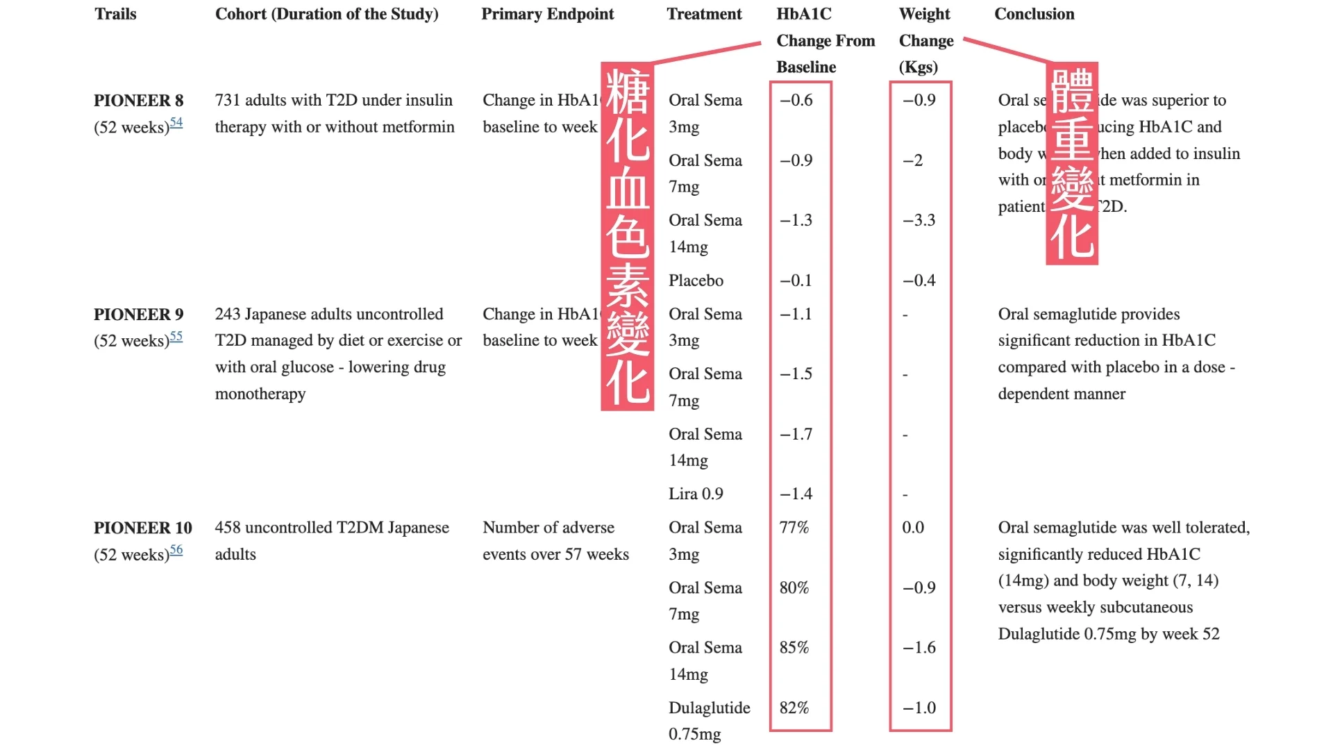 一篇針對瑞倍適控制第二型糖尿病及體重作用的論文〈A Peptide in a Pill – Oral Semaglutide in the Management of Type 2 Diabetes〉結果指出,經過52週,瑞倍適的預估平均體重變化為 -4.4 公斤——與善纖達相比,瑞倍適的體重減輕更顯著。