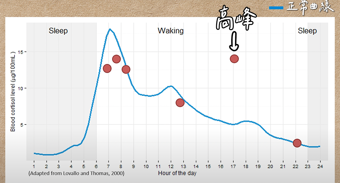 一般來說,皮質醇的最低點在半夜,過了半夜開始緩慢上升,六七點過後就到一天的高點,這時候人會自然起床面對一天的挑戰。隨時間過去,到了傍晚皮質醇會到低點,這時就會自然想睡覺。個人皮質醇的分泌量是否正常需透過檢測了解,但皮質醇分泌量會變化,如果是醫院抽血,可能會抽早上和下午;若希望更精密,則會四到六個時間點。皮質醇分泌情況與個人健康的具體關聯,以下面圖片展示: