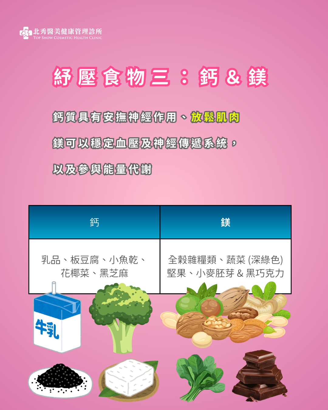 鈣質具有安撫神經作用、放鬆肌肉,富含鈣質的食物,像是乳品、板豆腐、小魚乾、花椰菜、黑芝麻等,或是鈣質補充營養品;鎂的部分,主要是因為壓力的關係,會讓體內的鎂,消耗殆盡,鎂主要是穩定血壓及神經傳遞系統,以及參與能量代謝。因此,也應該多攝取富含鎂的食物,飲食中有50%食物來自全榖雜糧類、蔬菜(深綠色)及堅果。另外,小麥胚芽的鎂含量也非常豐富唷!