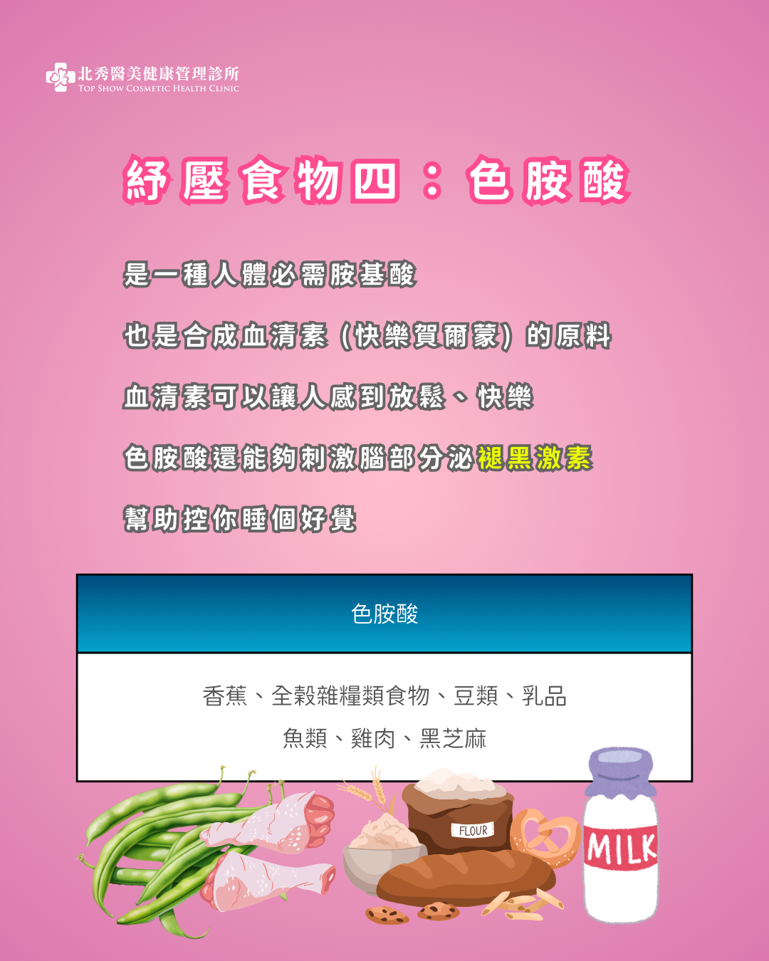 是一種人體「必需胺基酸」,必須由食物獲得。可以於大腦中製造血清素(快樂賀爾蒙),血清素可以減緩神經活動,達到放鬆,讓人感到快樂,所以,色胺酸是合成血清素的原料,富含色胺酸的食物有香蕉、全榖雜糧類食物、豆類、乳品、魚類、雞肉、黑芝麻等。另外,色胺酸還能夠刺激腦部分泌退黑激素,幫助控制睡眠與清醒週期,達到良好的睡眠品質。睡眠品質提升了,瘦體素的分泌較為正常,對於減重較有幫助,所以「睡得好,也有助於體重管理」喔!