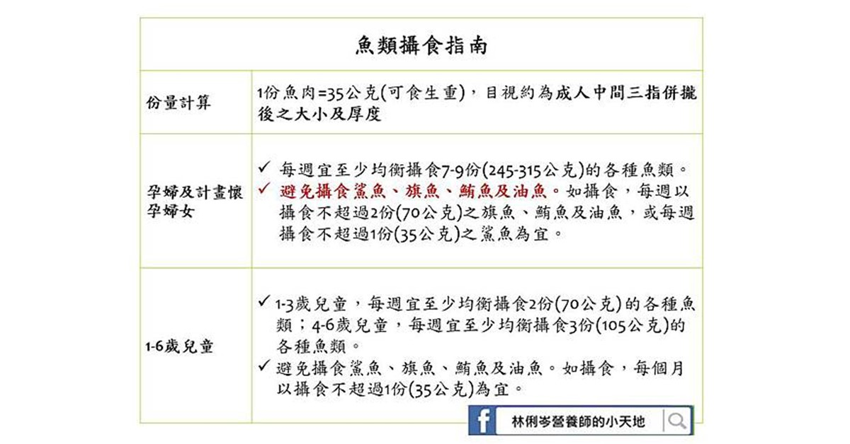 魚油這些年許多研究證實可以對抗憂鬱症,改善情緒低落、憂鬱等狀況,所以壓力大的人,平時可以多攝取富含Omega-3的魚類,另外像是亞麻仁油也具有素魚油之稱,吃素的朋友也可以多加利用。魚類的攝取指南,可以參考以下俐岑營養師所製作的圖表,魚類的攝取須留意高汞魚的攝取,不宜過量。