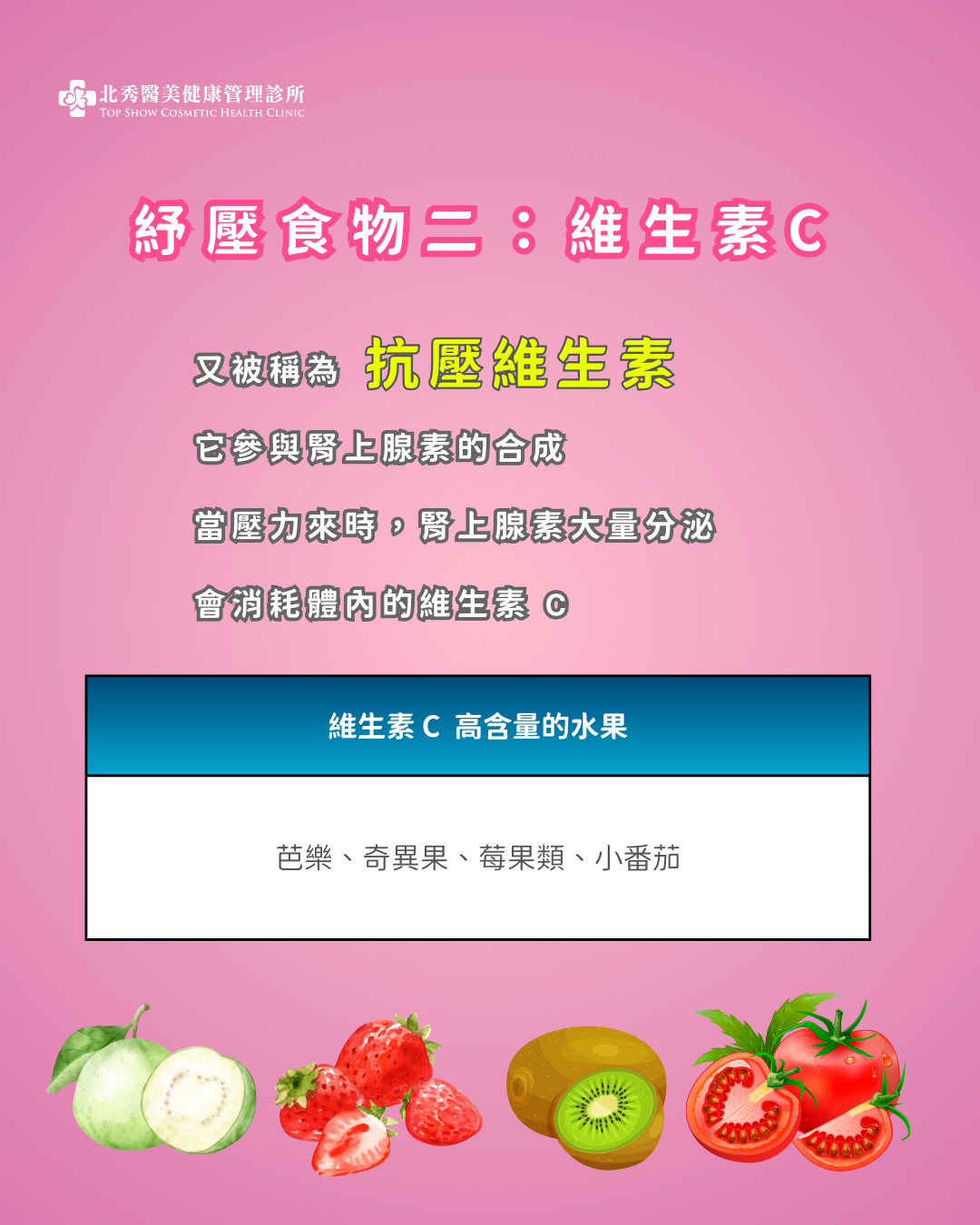 又可以稱為「抗壓維生素」,維生素C參與腎上腺素的合成,當壓力來時,腎上腺素大量分泌,會消耗體內的維生素C,因此,壓力大的人,應該額外多食用富含維生素C的食物,像是芭樂、奇異果、莓果類、小番茄等。每天一顆芭樂基本上就可以達到維生素C的建議攝取量了,若壓力較大的人或是有傷口需要修復的話,建議可以再增加一些奇異果、柑橘類的攝取,另外,維生素C也是有上限攝取劑量為2000毫克唷,若是以營養品做補充的方式,也可以稍微留意一下是否有超過劑量唷。