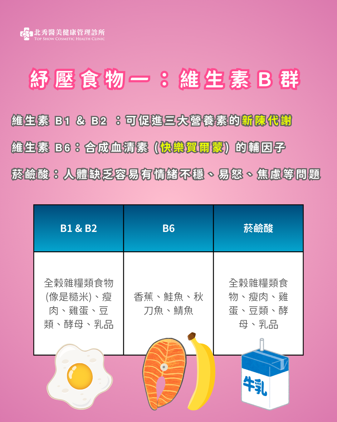 2)維生素B6:主要是幫助體內蛋白質的運作,合成血清素(快樂賀爾蒙)的輔因子,以及與腦部神經傳導有關,富含的食物有香蕉、鮭魚、秋刀魚、鯖魚等。